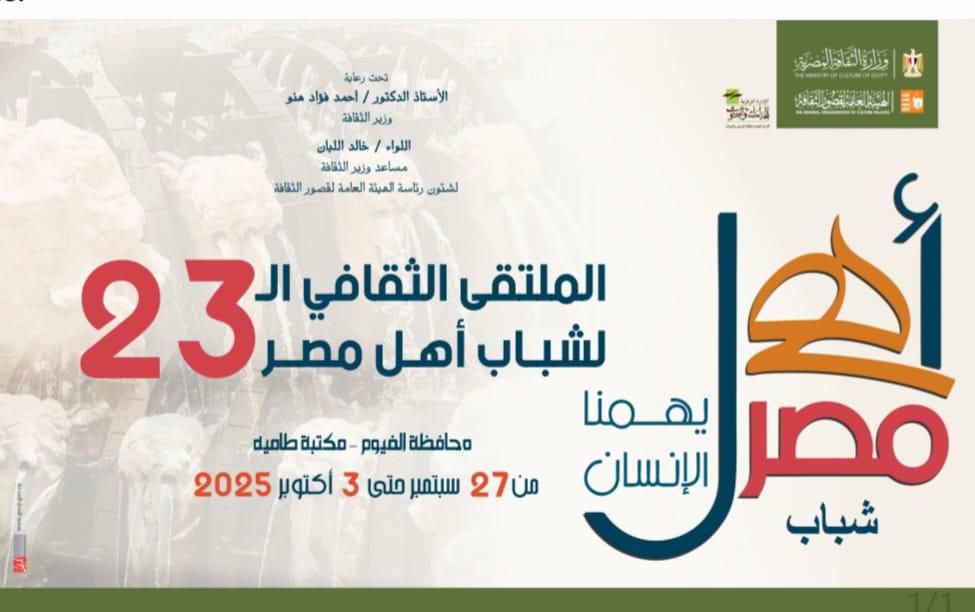 تنطلق في السادسة من مساء غد السبت، بمكتبة الطفل والشباب بطامية بمحافظة الفيوم، فعاليات الملتقى الثقافي الثالث والعشرين لشباب المحافظات الحدودية، ضمن مشروع “أهل مصر”، برعاية الدكتور أحمد فؤاد هنو وزير الثقافة، وتنظمه الهيئة العامة لقصور الثقافة برئاسة اللواء خالد اللبان، وتستمر فعالياته حتى 3 أكتوبر المقبل، تحت شعار “يهمنا الإنسان”.