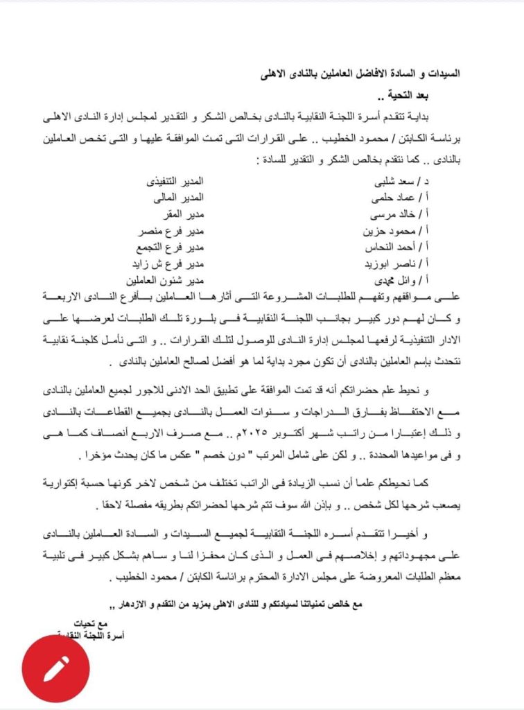 ووجهت اللجنة النقابية للعاملين بالنادي الأهلي الشكر إلي مجلس إدارة القلعة الحمراء برئاسة محمود الخطيب بعد الموافقة على تطبيق الحد الأدنى للأجور للعاملين بالقلعة الحمراء.