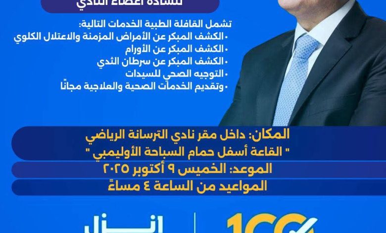 في ضوء توجيهات فخامة الرئيس عبد الفتاح السيسي رئيس الجمهورية، وتعليمات معالي السيد الدكتور وزير الصحة والسكان، وتحت إشراف مديرية الشئون الصحية بالجيزة، يعلن نادي الترسانة الرياضي عن استضافة قافلة طبية مجانية ضمن مبادرة “100 يوم صحة”، وذلك يوم الخميس الموافق 19 أكتوبر 2025 داخل مقر النادي.