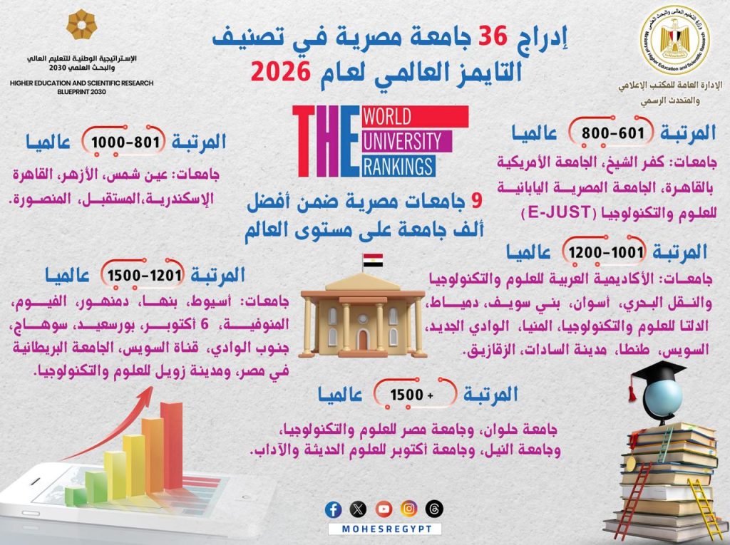 وأوضحت نتائج التصنيف أن الجامعات المصرية حققت هذا العام زيادة جديدة في عددها بالتصنيف، حيث بلغ عدد الجامعات المصرية المُدرجة 36 جامعة مقارنة بـ35 جامعة في نسخة عام 2025، أي بزيادة جامعة واحدة عن العام الماضي، مما يعكس استمرار التطور في ترتيب الجامعات المصرية ومكانتها داخل التصنيف الدولي، وذلك في إطار تنفيذ الاستراتيجية الوطنية للتعليم العالي والبحث العلمي، التي تضم مبدأ المرجعية الدولية كأحد محاورها الأساسية.
