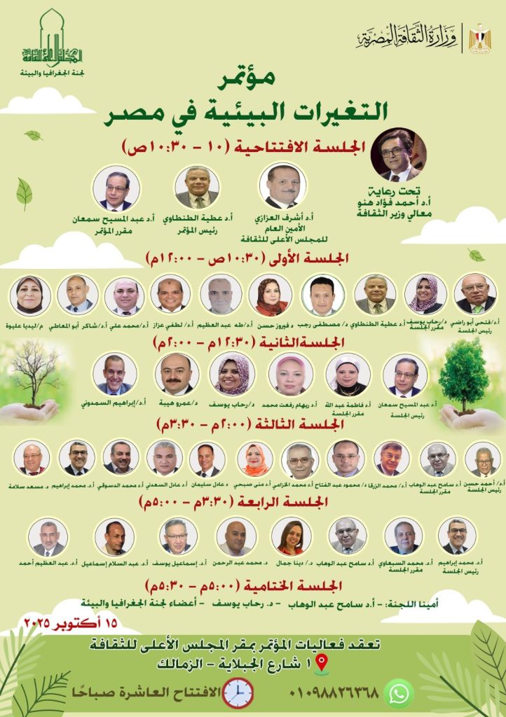 يطلق المجلس الأعلى للثقافة مؤتمر: “التغيرات البيئية في مصر”، والذي تنظمه لجنة الجغرافيا والبيئة بالمجلس برئاسة الدكتور عطية الطنطاوي مقرر لجنة الجغرافيا والبيئة، والذي يقام في تمام الساعة التاسعة صباح يوم الأربعاء الموافق ١٥ أكتوبر الحالي وتمتد الفعاليات حتى الخامسة والنصف مساء، بمقر المجلس الأعلى للثقافة باحة دار الأوبرا المصرية.