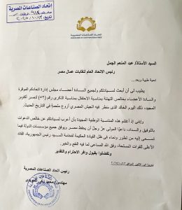 بعث اتحاد الصناعات المصرية، برئاسة المهندس محمد زكي السويدي، برقية تهنئة رسمية إلى الاتحاد العام لنقابات عمال مصر، برئاسة عبد المنعم الجمل، بمناسبة الاحتفال بالذكرى الـ52 لانتصارات أكتوبر المجيدة.
