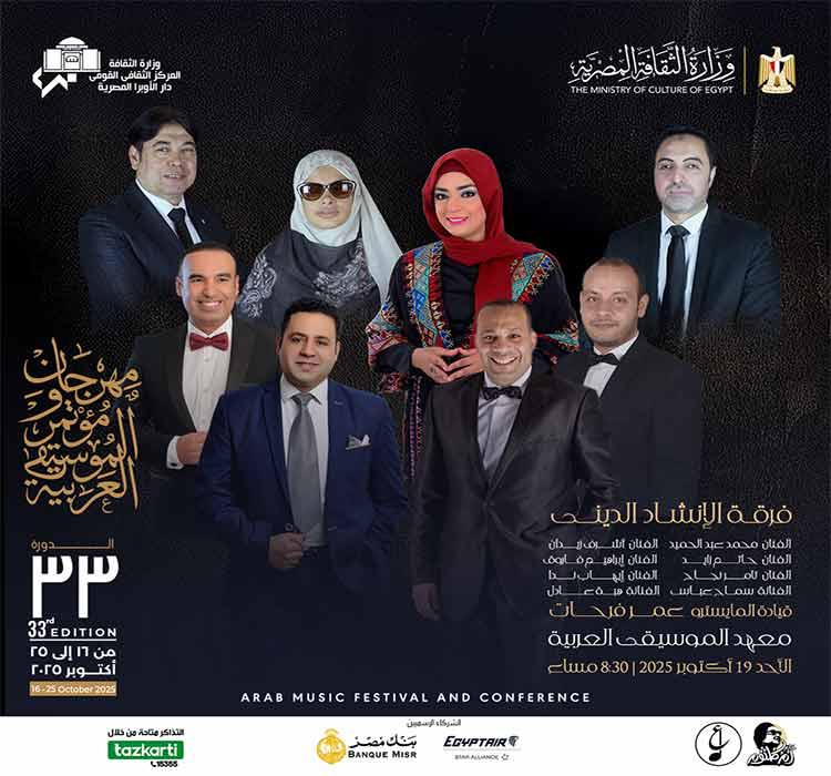 وعلى مسرح معهد الموسيقى العربية تقدم فرقة الإنشاد الدينى بقيادة المايسترو عمر فرحات حفلا بمشاركة محمد عبد الحميد، أشرف زيدان، حاتم زيدان، إبراهيم فاروق، تامر نجاح، إيهاب ندا، سماح عباس، وهبة عادل،