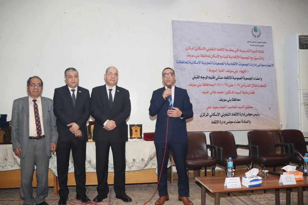 تحت رعاية الدكتور محمد هاني غنيم محافظ بني سويف اختتمت فعاليات الدورة التدريبية لأعضاء مجالس إدارات الجمعيات التعاونية الإسكانية لمحافظات بني سويف الفيوم المنيا أسيوط وأعضاء الجمعية العمومية للاتحاد ممثلي إقليم الوجه القبلي،التي نظمها الاتحاد التعاوني الإسكاني المركزي بقاعة مركز المؤتمرات كورنيش النيل بمدينة بني سويف.