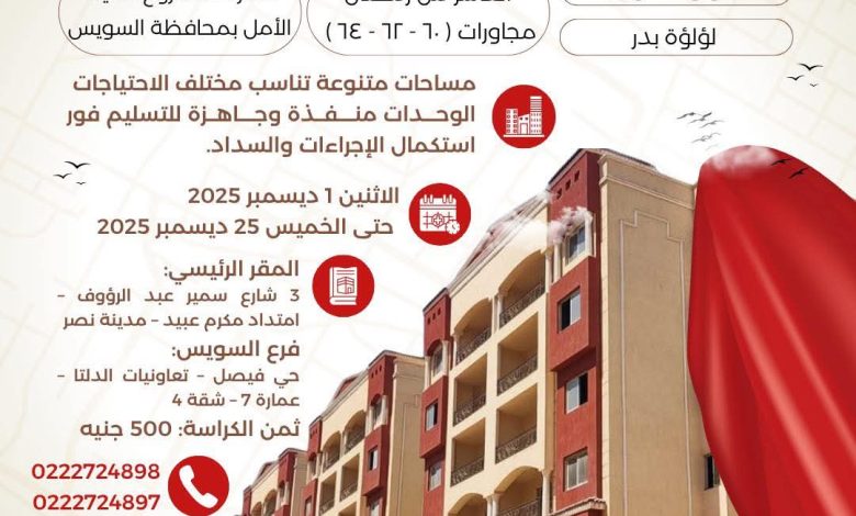 أعلنت الهيئة العامة لتعاونيات البناء والإسكان إحدى جهات وزارة الإسكان والمرافق والمجتمعات العمرانية عن فتح باب الحجز لـ ٢٥٣ وحدة سكنية بمواقع متميزة بمشروعات الهيئة.لؤلؤة القاهرة الجديدة، لؤلؤة أكتوبر لؤلؤة بدر، لؤلؤة العاشر من رمضان مجاورات 60 62 64 وفى ١٥ مايو مجاورة ۳۱ و بمحافظة السويس عمارات مشروع مدينة الأمل وذلك بمساحات مختلفة.