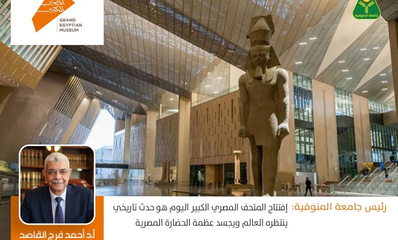 أعرب الدكتور أحمد القاصد رئيس جامعة المنوفية عن فخره وسعادته بمناسبة الحدث التاريخى الذى سوف تشهده الدولة المصرية مساء اليوم وينتظره العالم بأسره، وهو الافتتاح الرسمي للمتحف المصري الكبير، الذي يُعد أعظم مشروع ثقافي وأثري في القرن الحادي والعشرين.