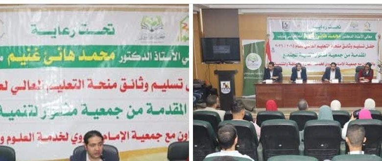 شهد بلال حبش نائب محافظ بنى سويف احتفالية تسليم وثائق منحة التعليم العالي للدراسة بالجامعات المصرية الحكومية والمُقدمة من جمعية مشوار لتنمية المجتمع بمحافظة الجيزة وبالتعاون مع جمعية الإمام النووي لخدمة العلوم والثقافة والتنمية ببني سويف.