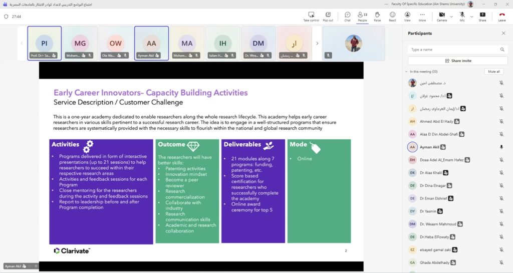 وخلال فعاليات الجلسة الافتتاحية، قدم د.مصطفى أمين مدير برامج بالصندوق عرضًا تعريفيًّا حول منسقي الجامعات ودورهم في تعزيز منظومة الابتكار داخل المؤسسات الأكاديمية، كما قدم د.أيمن عقيل ممثل شركة Clarivate عرضًا تفصيليًا حول خطة البرنامج وأهدافه وآليات تنفيذه داخل الجامعات، بحضور ممثلي 61 جامعة ومركزًا بحثيًّا من مختلف محافظات الجمهورية؛ بما يعكس حجم المشاركة والاهتمام بتعزيز بنية الابتكار في مصر.
