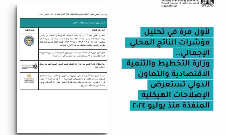 أعلنت وزارة التخطيط والتنمية الاقتصادية والتعاون الدولي، عن تضمين جانب من الإصلاحات الهيكلية المنفذة منذ يوليو 2024، في إطار البرنامج الوطني للإصلاحات الهيكلية، وذلك لأول مرة ضمن مؤشرات نمو الناتج المحلي للربع الأول من العام المالي 2025/2026، بما يُعزز مبادئ الشفافية والحوكمة ويعكس استدامة مسار الإصلاح الاقتصادي.