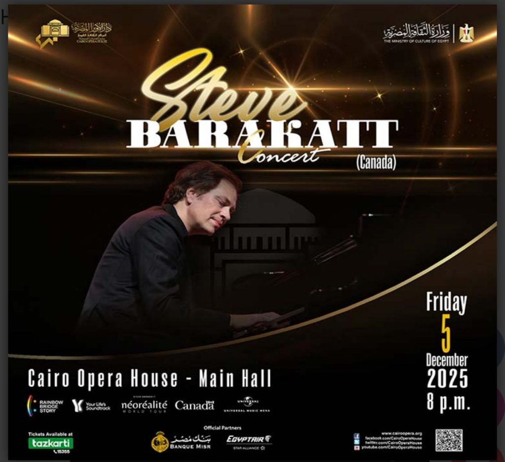 تقيم دار الأوبرا برئاسة الدكتور علاء عبد السلام بالتعاون مع سفارة كندا بالقاهرة حفلاً للمؤلف الموسيقى وعازف البيانو العالمى اللبنانى الأصل ستيف بركات الذى يزور مصر لأول مرة وذلك فى الثامنة مساء الجمعة ٥ ديسمبر على المسرح الكبير .