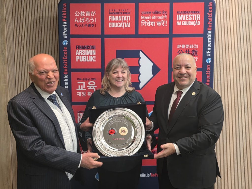 وفي ختام اللقاء، قام خلف الزناتي نقيب المعلمين المصريين بإهداء السيدة كورينا هايثورب رئيسة اتحاد المعلمين فى استراليا، درعاً تذكارياً يحمل شعار نقابة المهن التعليمية، وقد أعربت السيدة كورينا عن سعادتها بهذا التكريم، مؤكدة أنه يمثل خطوة مهمة نحو بناء شراكات أكثر فاعلية داخل المنظمة الدولية للتربية.
