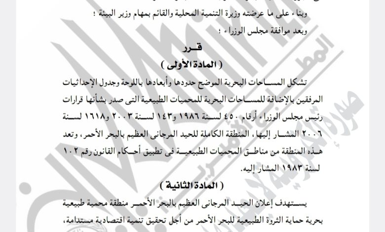 أصدر رئيس مجلس الوزراء الدكتور مصطفى مدبولي قرارًا رقم ٤٤١٩ لسنة ٢٠٢٥، يقضي بإضافة مساحات بحرية جديدة للحيد المرجاني العظيم بالبحر الأحمر لتصبح منطقة محميات طبيعية.
