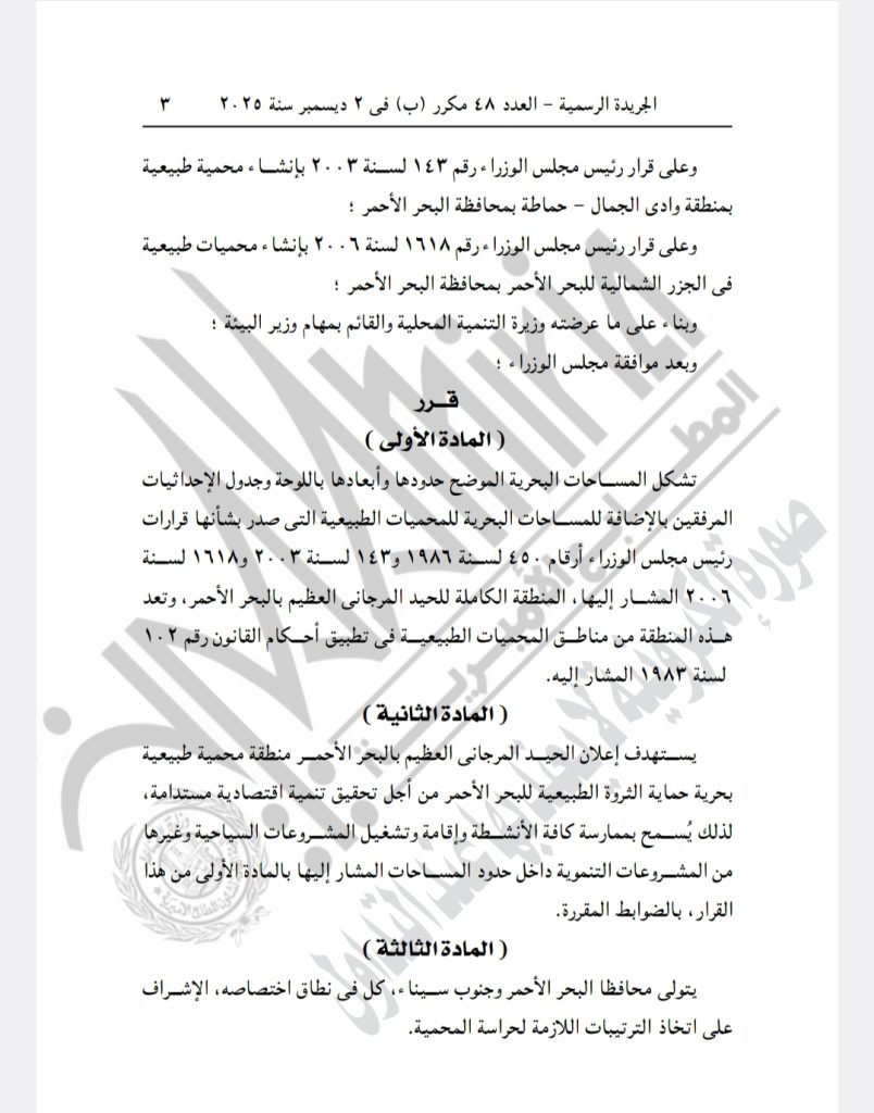 أصدر رئيس مجلس الوزراء الدكتور مصطفى مدبولي قرارًا رقم ٤٤١٩ لسنة ٢٠٢٥، يقضي بإضافة مساحات بحرية جديدة للحيد المرجاني العظيم بالبحر الأحمر لتصبح منطقة محميات طبيعية.
