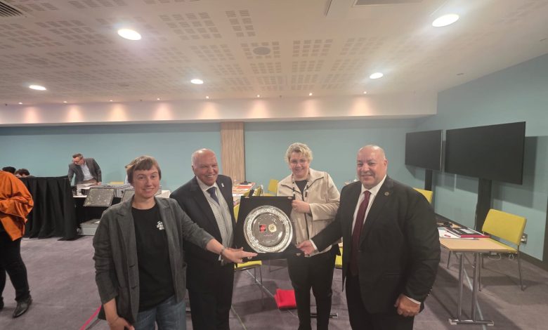 وفي ختام اللقاء، قام خلف الزناتي بإهداء مايكى فنيرين رئيسة الاتحاد الألمانى للتعليم ، درعاً تذكارياً يحمل شعار نقابة المهن التعليمية، مثمنا التعاون بين نقابة المعلمين المصرية مع الجانب الألماني .