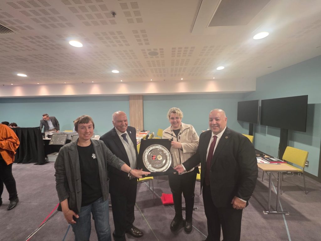 وفي ختام اللقاء، قام خلف الزناتي بإهداء مايكى فنيرين رئيسة الاتحاد الألمانى للتعليم ، درعاً تذكارياً يحمل شعار نقابة المهن التعليمية، مثمنا التعاون بين نقابة المعلمين المصرية مع الجانب الألماني .