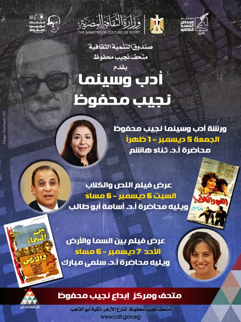 في إطار احتفال مركز ومتحف نجيب محفوظ، الكائن بتكية محمد أبو الدهب التابعة للصندوق بجوار الجامع الأزهر، بالذكرى الـ 114 لميلاد صاحب “الثلاثية”، يُطلق المتحف على مدار ثلاثة أيام ورشة “سينما وأدب نجيب محفوظ”.