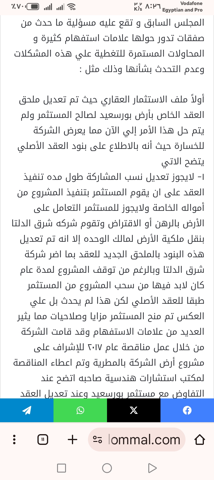 أولاً ملف الاستثمار العقاري حيث تم تعديل ملحق العقد الخاص بأرض بورسعيد لصالح المستثمر ولم يتم حل هذا الأمر إلي الآن مما يعرض الشركة للخسارة حيث أنه بالاطلاع على بنود العقد الأصلي يتضح الاتي