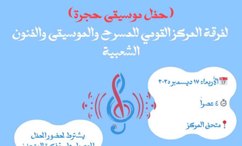 يقيم المركز القومي للمسرح والموسيقى والفنون الشعبية برئاسة المخرج عادل حسان، حفل موسيقى حجرة داخل المتحف القومي للمسرح والموسيقى والفنون الشعبية، وذلك الساعة الرابعة عصر غدا الأربعاء ١٧ ديسمبر ٢٠٢٥م؛ بمقر المركز الكائن ب٩ش حسن صبري بالزمالك، تقدم خلالها مجموعة التريو الكلاسيكية بالمركز مختارات الموسيقى الكلاسيكية والعالمية للعازفين: الفنان عمرو إمام (آلة الكلارينيت)، محمد مصطفى (آلة الكلارينيت)، والفنانة رنا نوفل (آلة الفاجوط) تحت إشراف د. رانيا عمر المشرف على الفرقة الموسيقية بالمركز.