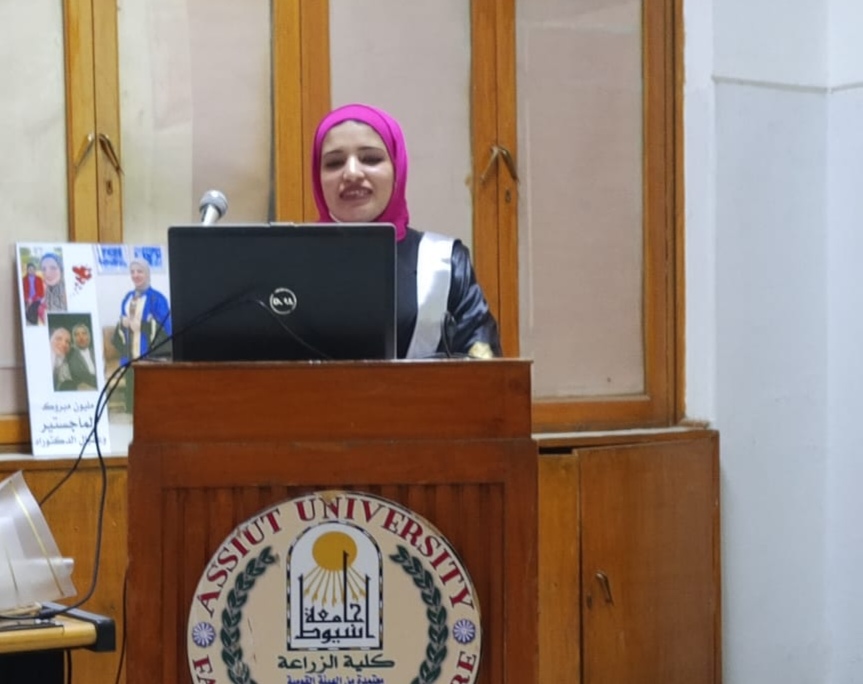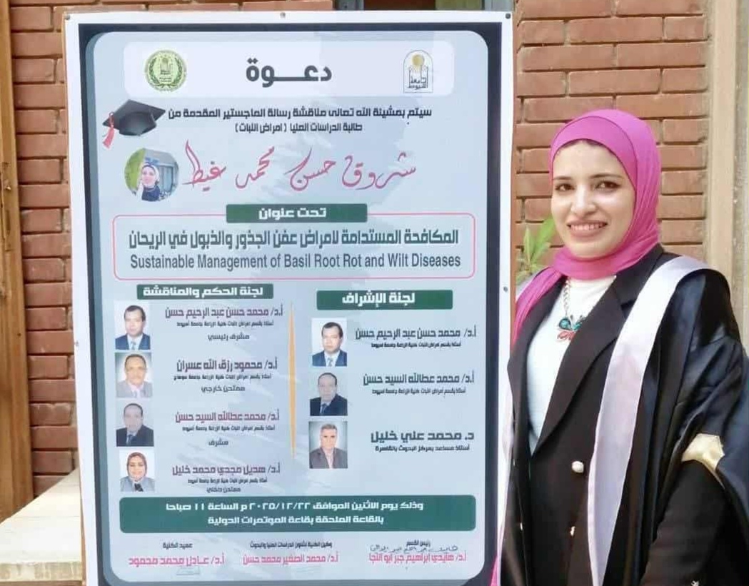 حصلت الباحثة، شروق حسن محمد غيط، الباحثة بكلية الزراعة – جامعة أسيوط،على درجة الماحستير بتقدير امتياز ، وذلك عن رسالة تحت عنوان، المكافحة المستدامة لامراض عفن الجذور والذبول في الريحان، في حضور نخبة من السادة أعضاء هيئة التدريس والباحثين.