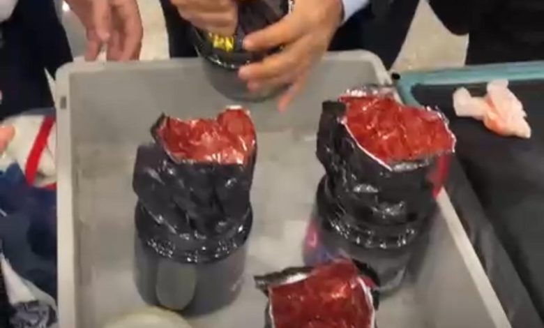 وقام مدير الحركة بتكليف احمد شاكر مأمور الجمرك بتفتيش حقائب الراكب علي جهاز الفحص بالأشعة والذي تلاحظ له وجود عبوات يشتبه ان يكون بها مواد عضوية أيضا، تم تكليف توماس فريد مامور الجمرك بتفتيش الراكب يدويا مما اسفر عن ضبط أربعة عبوات(برطمانات) بهم نفس الماده مع الراكب الاول وبسؤال الراكبين عن ما هو موجود بالعبوات قالا انها معسل وبفحص تليفون الراكب وتتبع باقي ركاب الرحلة تم ضبط راكبين اخرين بحوزة كل منهما عبوه (برطمان) بهما نفس المادة والتي افاد رجال ادارة مكافحة المخدرات بمطار القاهرة برئاسة العميد باسم حجاج بانها مادة بودر الحشيش المخدر