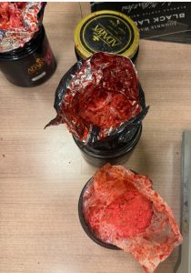 قام خالد شعبان مدير ادارة الحركة المشرف على صالة الوصول بمبني ٢ بتكليف مينا فهيم مأمور الجمرك بتفتيش حقائب الراكب علي جهاز الفحص بالأشعة والذي تلاحظ له وجود عبوات يشتبه ان يكون بها مواد عضوية تم تكليف سامي نبيل مأمور الجمرك بتفتيش حقائب الراكب يدويا مما اسفر عن ضبط أربعة عبوات(برطمانات) بهم مواد ورديه اللون يشتبه ان تكون مواد مخدرة مع بعض المعسل