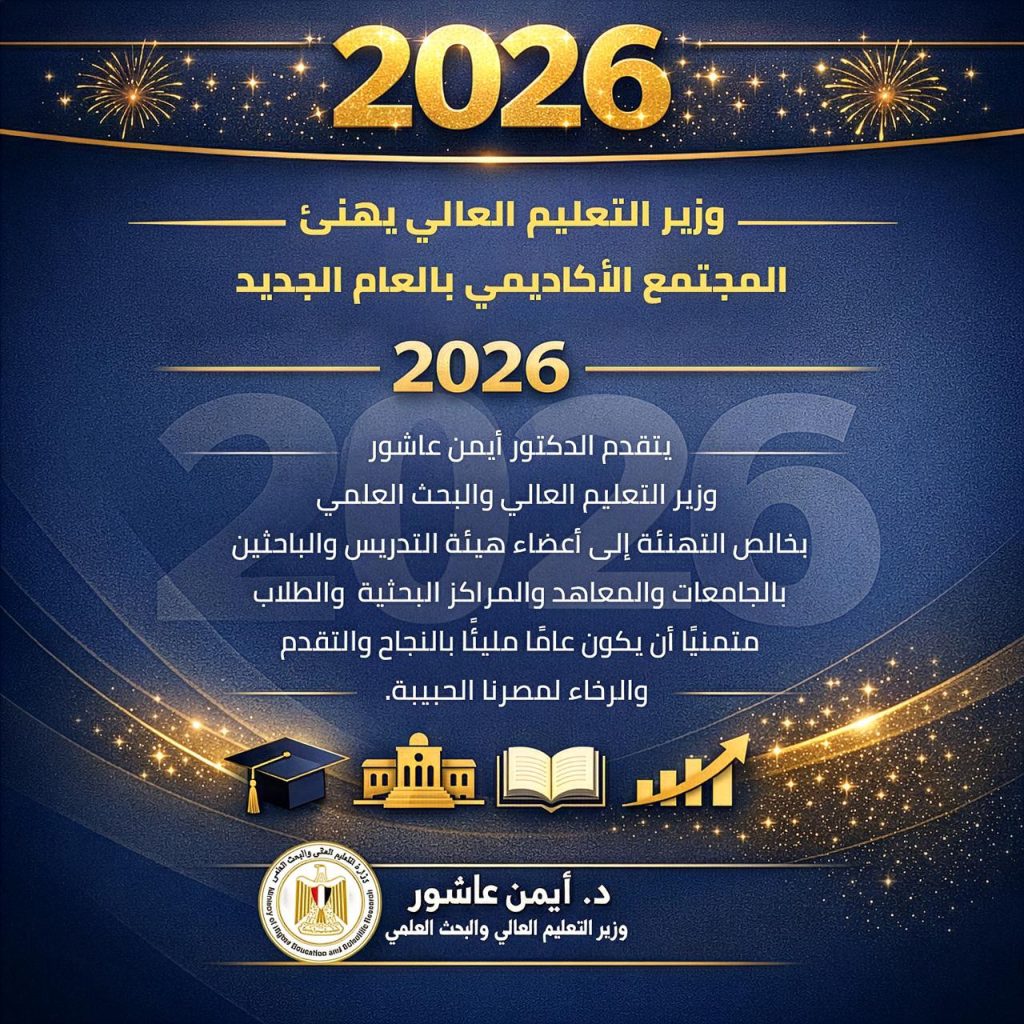 يتقدم الدكتور أيمن عاشور وزير التعليم العالي والبحث العلمي، بخالص التهنئة إلى أعضاء هيئة التدريس والباحثين بالجامعات والمعاهد والمراكز البحثية والجهاز الإداري، وطلاب الجامعات والمعاهد، بمناسبة حلول العام الميلادي الجديد ٢٠٢٦، متمنيًا أن يكون عامًا مليئًا بالنجاح والتقدم والرخاء لمصرنا الحبيبة، ويحقق فيه المجتمع الأكاديمي مزيدًا من الإنجازات والتميز.
