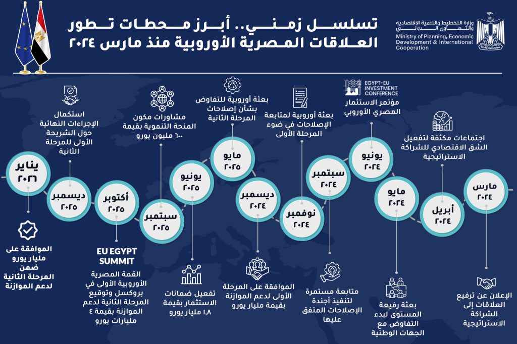 وفي التقرير التالي، تستعرض وزارة التخطيط والتنمية الاقتصادية والتعاون الدولي، التسلسل الزمني لأبرز محطات تطور العلاقات المصرية الأوروبية، منذ مارس 2024، وذلك عقب الإعلان عن حصول مصر على مليار يورو، تُمثل الشريحة الأولى من المرحلة الثانية لآلية مساندة الاقتصاد الكلي ودعم الموازنة MFA، حيث تضطلع الوزارة بمتابعة تنفيذ الشق الاقتصادي للشراكة بين الجانبين.
