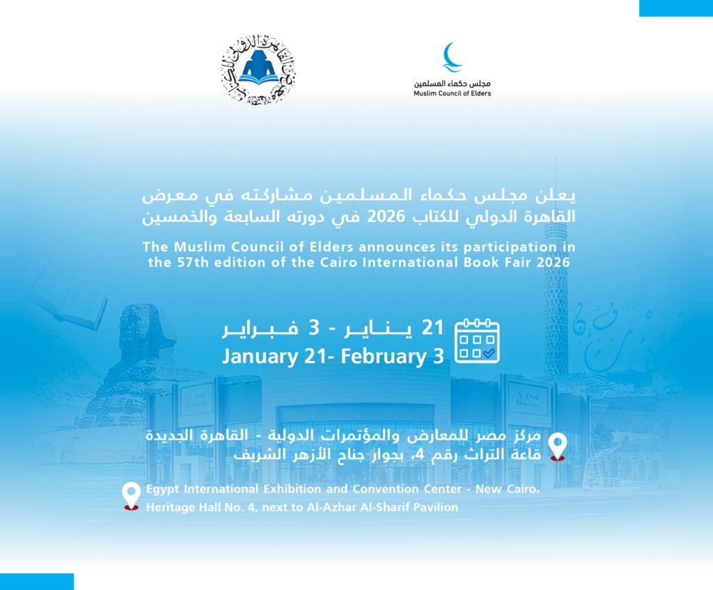 يشارك مجلس حكماء المسلمين بجناح خاص في الدورة الـ 57 من معرض القاهرة الدولي للكتاب 2026، الذي يُقامُ خلال الفترة من 21 يناير الجاري حتى 3 فبراير القادم؛ انطلاقًا من رسالته الهادفةِ إلى تعزيز السِّلم، وترسيخ قيم الحوار والتسامح ومد جسور التعاون بين بني البشر على اختلافِ أجناسهم ومعتقداتهم.