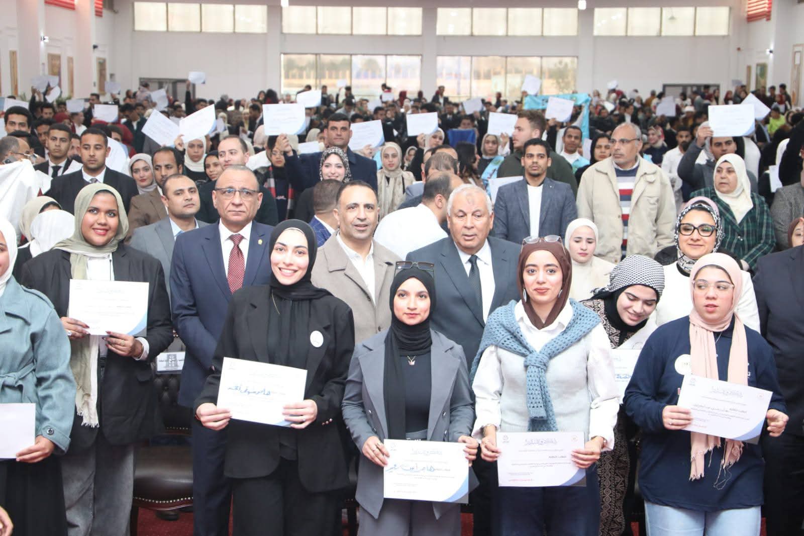 وعلى هامش الفعاليات، أدار المحافظ حواراً مفتوحاً مع الطلاب المشاركين، تبادل خلاله الرؤى والأفكار، مُجيباً على استفساراتهم ومناقشاً مقترحاتهم في أجواءٍ تفاعلية مثمرة، حيث اختتم الحفل بتبادل الدروع التذكارية بين المحافظة ووزارة التضامن الإجتماعي والجامعة، و تكريم نخبة من المتطوعين المتميزين، والتقاط الصور التذكارية مع الوفود المشاركة وطلاب الجامعات.