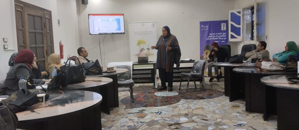 وهدفت الورشة التدريبية إلى بناء قدرات المتعاملين مع الأطفال في مرحلة الطفولة المبكرة، والتدريب على دليل الكفاءات للمتعاملين مع الأطفال من الولادة وحتى سن 6 سنوات، بمشاركة ممثلي الجهات الشريكة من وزارة التضامن الاجتماعي، ووزارة التربية والتعليم، ووزارة الصحة، ووزارة الثقافة، وممثلي وحدات حماية الطفل العامة.
