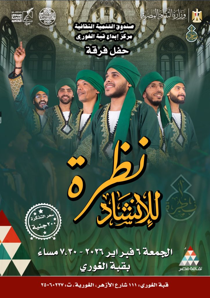 يستضيف مركز إبداع قبة الغوري بشارع الأزهر – التابع لقطاع صندوق التنمية الثقافية – حفلًا فنيًا تحييه فرقة «نظرة للإنشاد الديني»، وذلك في تمام الساعة السابعة والنصف مساء يوم الجمعة الموافق 6 فبراير .