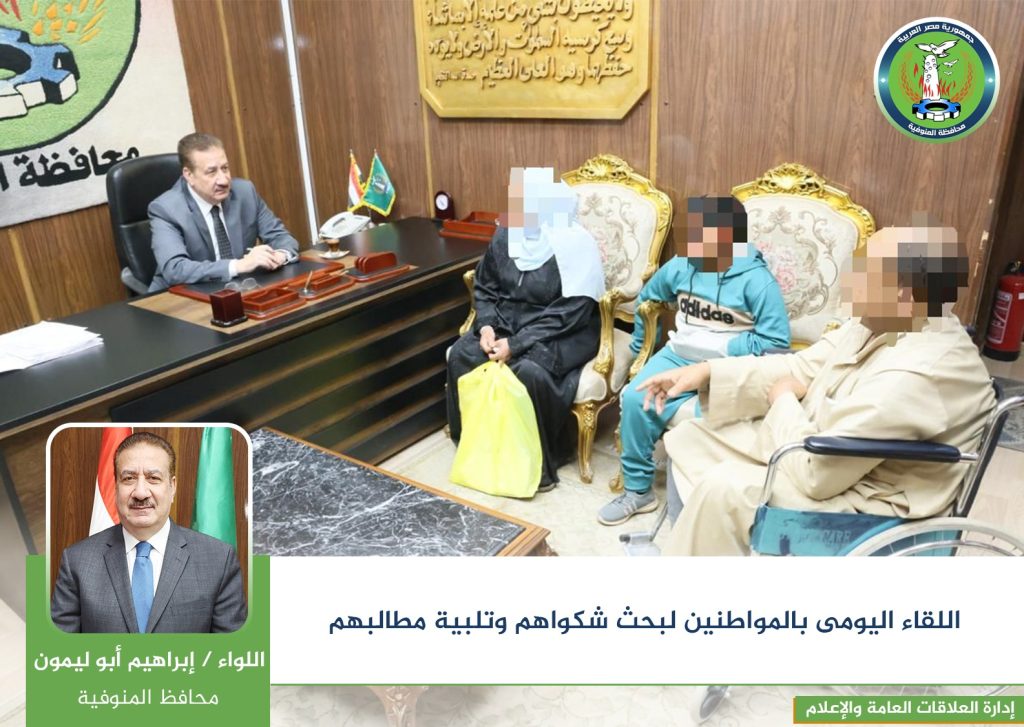 واصل اليوم اللواء إبراهيم أبو ليمون محافظ المنوفية سلسلة لقاءاته اليومية بالمواطنين بمكتبه بالديوان العام، وذلك في إطار حرصه على التواصل المباشر مع المواطنين والوقوف على احتياجاتهم.