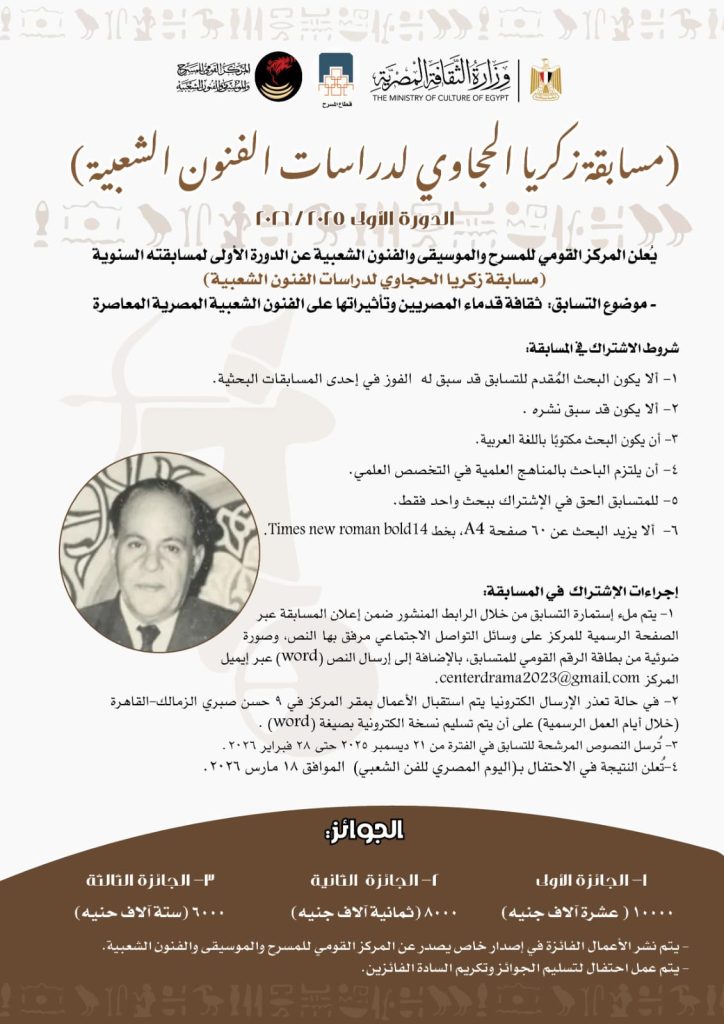 أعلن المخرج عادل حسان مدير المركز القومي للمسرح والموسيقى والفنون الشعبية استمرار فتح فترة التقديم لمسابقة “زكريا الحجاوي لدراسات الفنون الشعبية” حتى ٢٨ فبراير ٢٠٢٦م، وذلك لمنح الفرصة للباحثين للتقدم إلى المسابقة.
