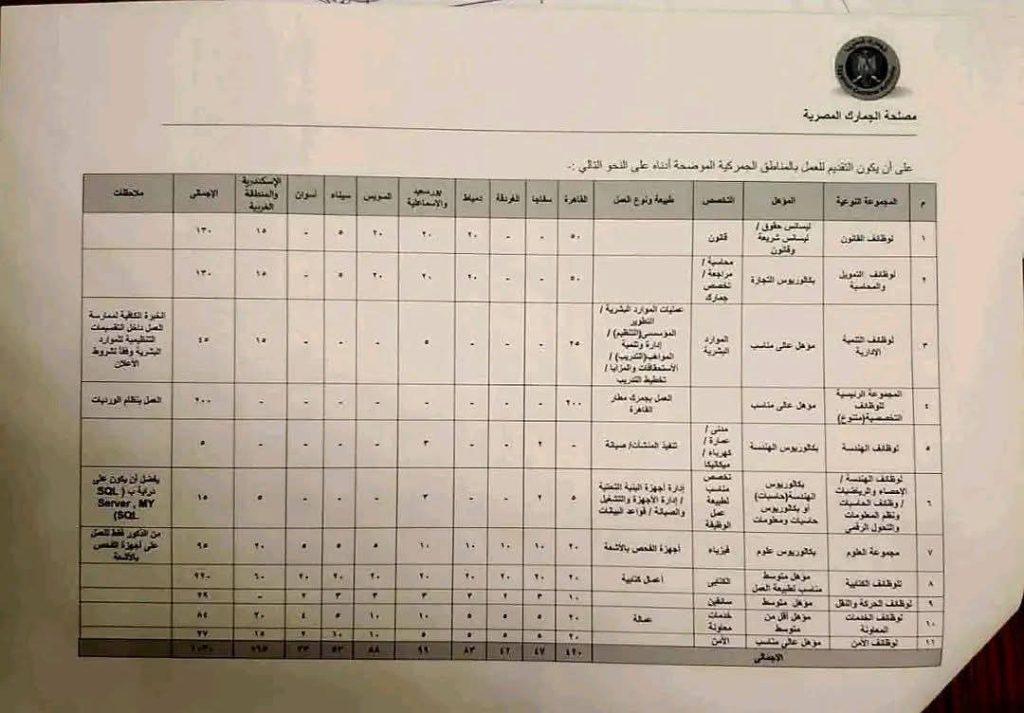 إجمالي العدد المطلوب: حوالي 1036 موظفًا موزعين على المنافذ الجمركية المختلفة.