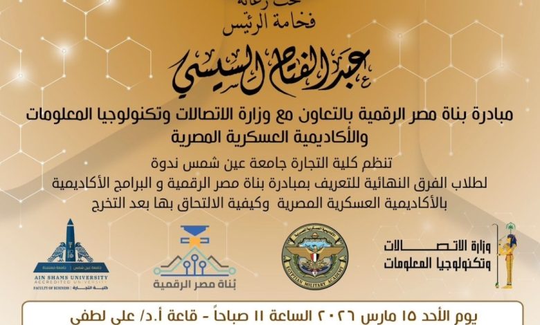 في خطوة استراتيجية تهدف إلى تمكين الشباب المصري وتأهيلهم لقيادة قاطرة التحول الرقمي، وتحت رعاية الدكتور محمد ضياء زين العابدين، رئيس جامعة عين شمس، والدكتور رامي ماهر نائب رئيس الجامعة لشئون التعليم والطلاب و الدكتور فريد محرم الجارحي، عميد كلية التجارة، تستعد كلية التجارة لاستضافة حدث استثنائي يوم الأحد المقبل، للكشف عن تفاصيل الانضمام للمبادرة الرئاسية الرائدة “بُناة مصر الرقمية”، وطرح فرص أكاديمية ومهنية واعدة لطلاب الفرق النهائية.