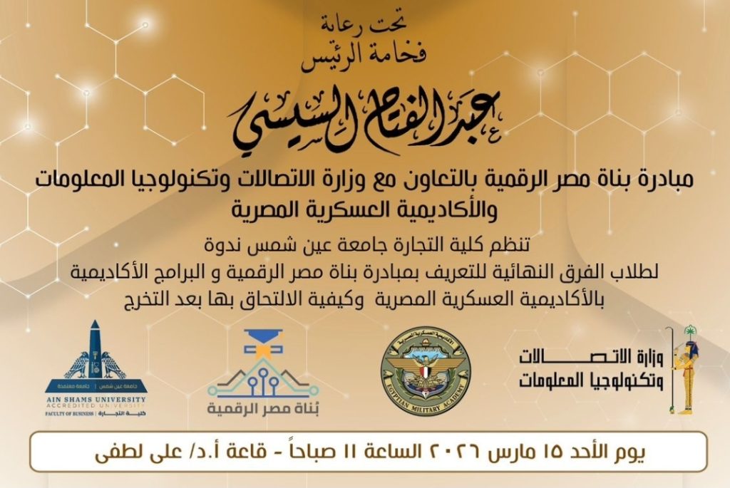 يُعقد الحدث يوم الأحد الموافق 15 مارس 2026، في تمام الساعة الحادية عشرة صباحاً بقاعة الأستاذ الدكتور علي لطفي بكلية التجارة – جامعة عين شمس.