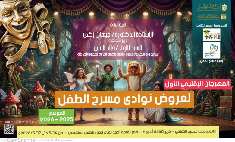 أعلن اللواء محمد علوان محافظ أسيوط، انطلاق فعاليات مهرجان عروض نوادي مسرح الطفل بإقليم وسط الصعيد الثقافي مساء السبت 14 مارس 2026، على مسرح قصر ثقافة أحمد بهاء الدين المتخصص للطفل، وذلك ضمن برامج وزارة الثقافة والهيئة العامة لقصور الثقافة، على أن تستمر فعالياته حتى الثلاثاء 17 مارس الجاري.
