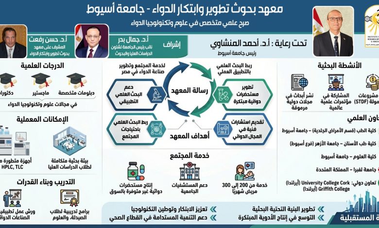 في إطار توجه جامعة أسيوط نحو تعزيز البحث العلمي التطبيقي ومواكبة التطورات العالمية في قطاع الصناعات الدوائية، وتحت رعاية الدكتور أحمد المنشاوي رئيس جامعة أسيوط، يواصل معهد بحوث وتطوير وابتكار الدواء ترسيخ مكانته كأحد الصروح العلمية المتخصصة التي تسهم في تطوير الدواء وخدمة المجتمع، من خلال منظومة متكاملة تجمع بين البحث العلمي والخدمات التطبيقية والتدريب، وذلك بإشراف الدكتور جمال بدر، والدكتور حسن رفعت المشرف على معهد بحوث وابتكار الدواء.