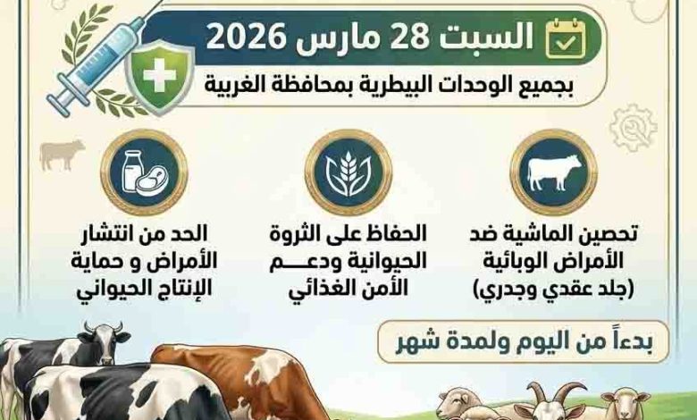 أعلن اللواء دكتور علاء عبدالمعطي، محافظ الغربية، انطلاق أعمال الحملة القومية الأولى لعام 2026 لتحصين الماشية ضد مرض الجلد العقدي في الأبقار وجدري الأغنام.