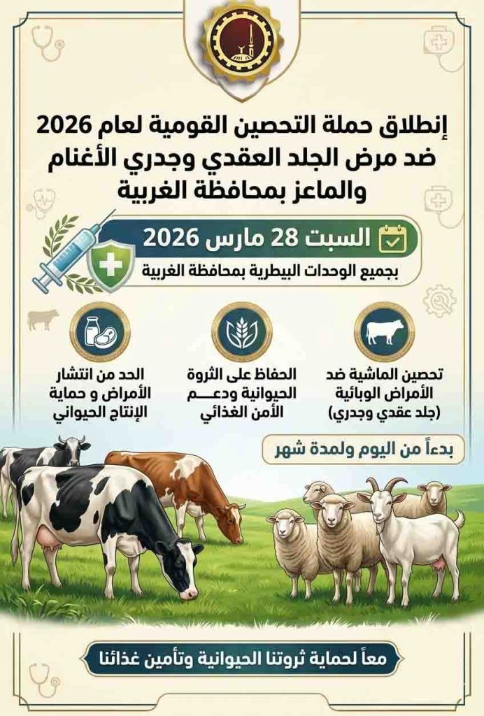 أعلن اللواء دكتور علاء عبدالمعطي، محافظ الغربية، انطلاق أعمال الحملة القومية الأولى لعام 2026 لتحصين الماشية ضد مرض الجلد العقدي في الأبقار وجدري الأغنام.