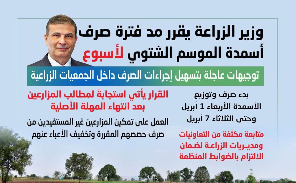 وأكد وزير الزراعة، أن الهدف من هذه المهلة الاستثنائية تمكين المزارعين الذين لم يتمكنوا من صرف حصصهم المقررة من استلامها، وذلك دعماً للفلاح المصري وتخفيفاً للأعباء عنه، بما يضمن وصول الدعم لمستحقيه وتعظيم إنتاجية المحاصيل الشتوية.