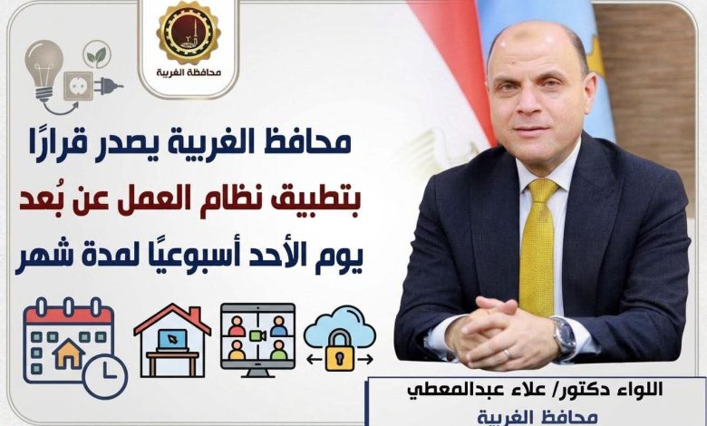 أصدر اللواء دكتور علاء عبدالمعطي، محافظ الغربية، كتابًا دوريًا موجَّهًا لرؤساء المراكز والمدن والأحياء، ومديري المديريات الخدمية، ورؤساء الهيئات والشركات، بتطبيق نظام “العمل عن بُعد” يوم الأحد من كل أسبوع، اعتبارًا من الغد 5 أبريل 2026 ولمدة شهر كامل.