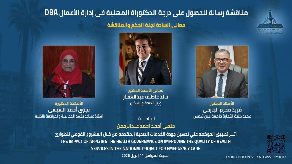 تحت رعاية د.محمد ضياء زين العابدين رئيس جامعة عين شمس، ود. اماني اسامة كامل نائب رئيس الجامعة لشئون الدراسات العليا والبحوث، ود.فريد محرم الجارحي عميد كلية التجارة، تستعد كلية التجارة جامعة عين شمس لحدث أكاديمي بارز، حيث تشهد يوم السبت الموافق 11 إبريل 2026، مناقشة رسالة للحصول على درجة الدكتوراة المهنية في إدارة الأعمال (DBA) مقدمة من الباحث حلمي أحمد أحمد عبد الرحمن.