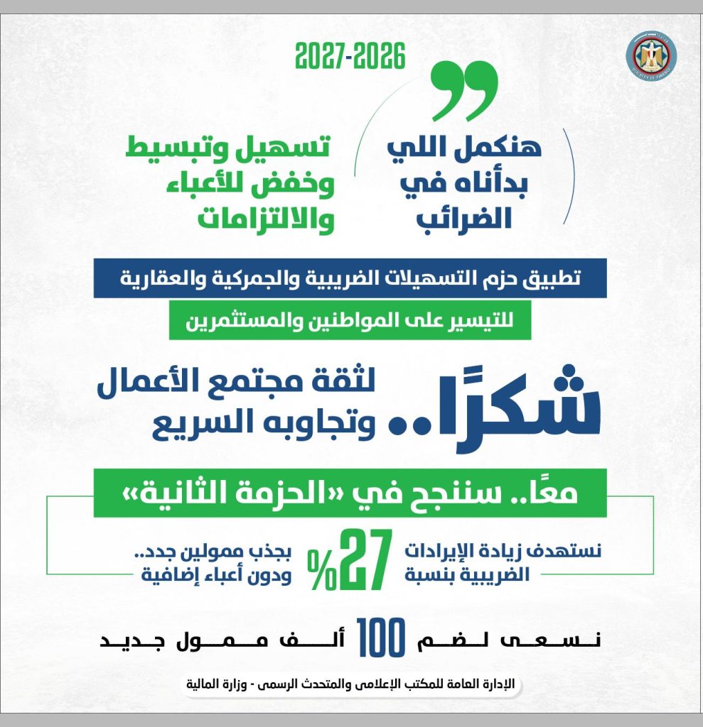 وقال أحمد كجوك وزير المالية، في مؤتمر صحفي،: «شكرًا.. لثقة مجتمع الأعمال وتجاوبه السريع والقوي في الحزمة الأولى للتسهيلات الضريبية.. ومعًا سننجح في الحزمة الثانية»، موضحًا أننا نستهدف زيادة الإيرادات الضريبية بنسبة ٢٧٪ من خلال جذب ممولين جدد طواعية ودون أعباء إضافية، ونتطلع لضم ١٠٠ ألف ممول جديد للنظام الضريبي المبسط والمتكامل بحوافز وتسهيلات غير مسبوقة.