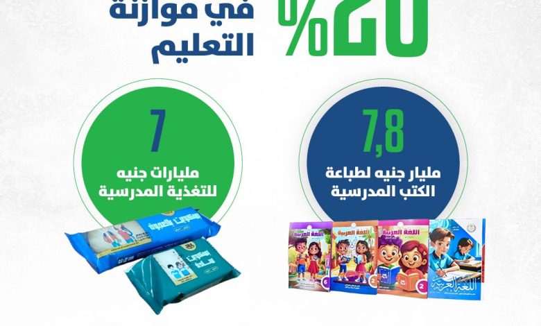 وأوضح كجوك، أنه تم تخصيص ٧,٨ مليار جنيه بالموازنة الجديدة لطباعة الكتب الدراسية بالتعليم قبل الجامعي، و٧ مليارات جنيه للتغذية المدرسية للطلاب.