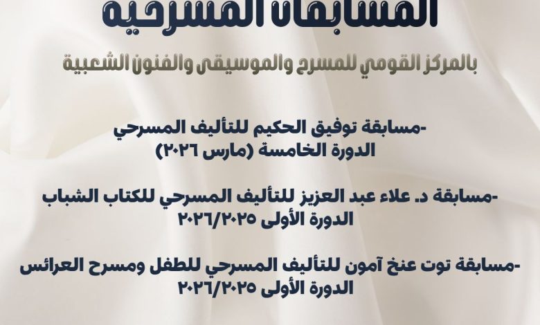 في إطار دعم وزارة الثقافة للكُتّاب المسرحيين، وتقديم مبدعين جُدد في مجال الكتابة المسرحية، وتحت رعاية د. جيهان زكي وزيرة الثقافة، وبإشراف رئيس قطاع المسرح الدكتور أيمن الشيوي، ينظم المركز القومي للمسرح والموسيقى والفنون الشعبية برئاسة المخرج عادل حسان؛ حفلا لتوزيع جوائز الفائزين بمسابقات التأليف المسرحي (توفيق الحكيم للتأليف المسرحي-الدورة الخامسة مارس ٢٠٢٦، د. علاء عبدالعزيز سليمان للتأليف المسرحي للكُتّاب الشباب-الدورة الأولى ٢٠٢٦/٢٠٢٥، توت عنخ آمون للتأليف المسرحي في فرعيّ مسرح الطفل ومسرح العرائس الدورة الأولى ٢٠٢٦/٢٠٢٥) التي أقامها المركز خلال الفترة من ١ ديسمبر ٢٠٢٥م وحتى ٢٨ فبراير ٢٠٢٦م، وذلك الساعة الرابعة عصر الثلاثاء القادم ٢١ إبريل بقاعة المؤتمرات بالمجلس الأعلى للثقافة.