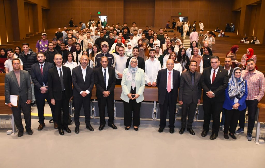 بحضور د. ياسين الشاذلى عميد كلية الحقوق ود يمنى صفوت عميد كلية الألسن و أ.د.هبة بركات وكيل كلية البنات و أ.د. محمد مرسى وكيل كلية التجارة و أ.د حنان سالم وكيل كلية الآداب واللواء حسام الشربيني أمين الجامعة المساعد لشئون خدمة المجتمع وتنمية البيئة .