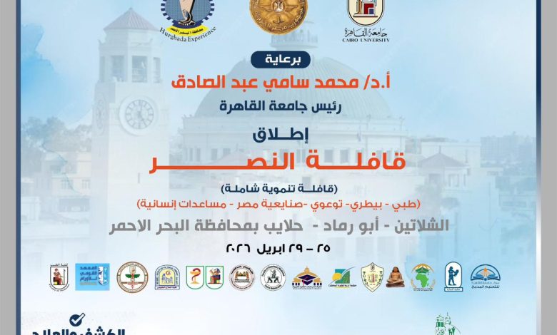 وتأتي القافلة، التي انطلقت في 24 أبريل الجاري وتستمر لمدة أربعة أيام، تحت رعاية الدكتور محمد سامي عبدالصادق، رئيس جامعة القاهرة، وإشراف الدكتور محمد رفعت، نائب رئيس الجامعة لشئون خدمة المجتمع وتنمية البيئة، وبرئاسة الدكتورة إيمان هريدي، عميد كلية الدراسات العليا للتربية، وبمشاركة نخبة متميزة من أعضاء هيئة التدريس والكوادر الطبية والمتخصصة من مختلف كليات وقطاعات الجامعة.