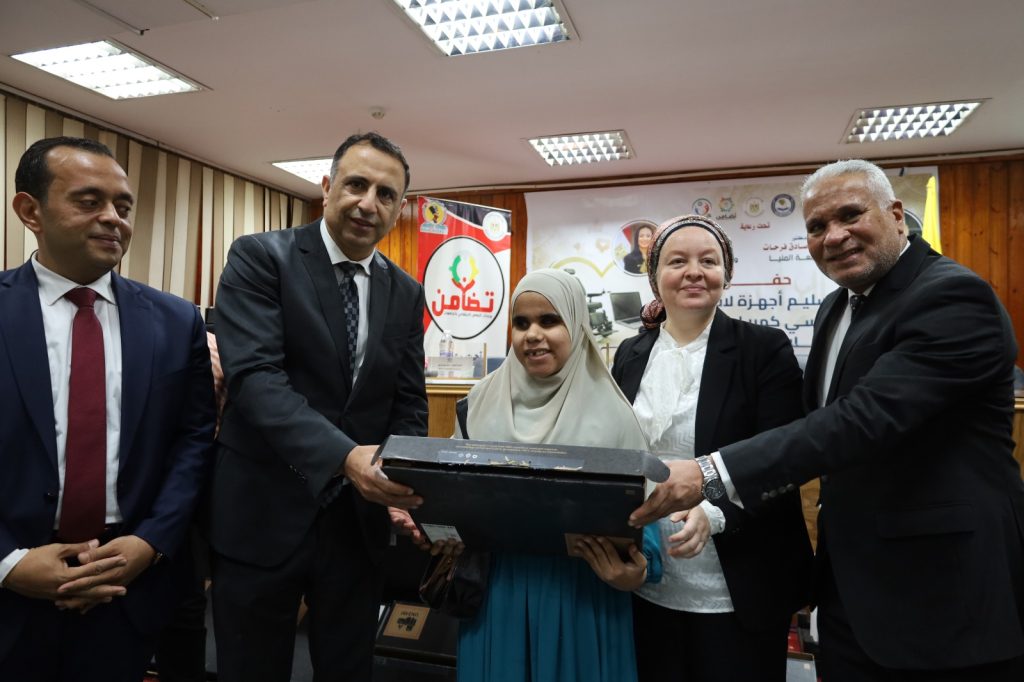 وشهدت الاحتفالية توزيع وحدة التضامن الاجتماعي بجامعة المنيا، 25 لاب توب ناطق و10 كراسي متحركة للطلاب من ذوي الإعاقة، ويأتي ذلك في إطار حرص وحدات التضامن الاجتماعي لدعم الطلاب من ذوي الإعاقة.